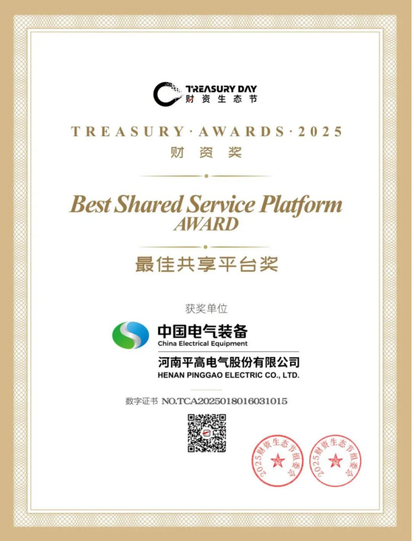9月26日,平高電氣在第六屆財資生態(tài)節(jié)暨第十三屆中國財資年會的2025財資獎(Treasury ?Awards 2025)評選中獲得“最佳共享平臺獎”(Best Shared Service Platform Award)。該獎項旨在表彰在財務(wù)共享中心建設(shè)方面具有出色表現(xiàn)的企業(yè),充分體現(xiàn)了業(yè)界對平高電氣財務(wù)共享創(chuàng)新實踐的認(rèn)可。