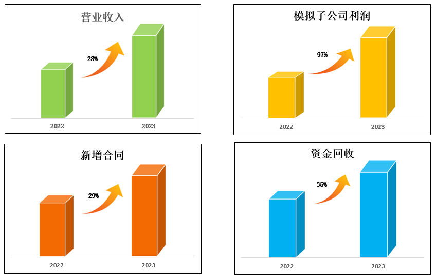 2023年,營業(yè)收入同比增長28%;利潤同比增長97%;新增合同同比增長29%;資金回收同比增長35%。