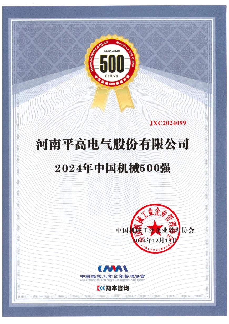 12月25日,從河南平高電氣股份有限公司(以下簡(jiǎn)稱“平高電氣”)獲悉,在近日中國(guó)機(jī)械工業(yè)企業(yè)管理協(xié)會(huì)召開(kāi)的2024年世界一流暨中國(guó)機(jī)械500強(qiáng)研究報(bào)告發(fā)布、示范工程表彰大會(huì)上,平高電氣憑借卓越的綜合實(shí)力成功斬獲“2024年中國(guó)機(jī)械500強(qiáng)”榮譽(yù)稱號(hào),這一佳績(jī)是其多年來(lái)穩(wěn)健發(fā)展的有力見(jiàn)證,也彰顯了其在行業(yè)內(nèi)不斷攀升的影響力。
